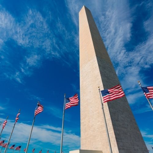 Walk past the Capitol, White House (exterior), and Washington Monument