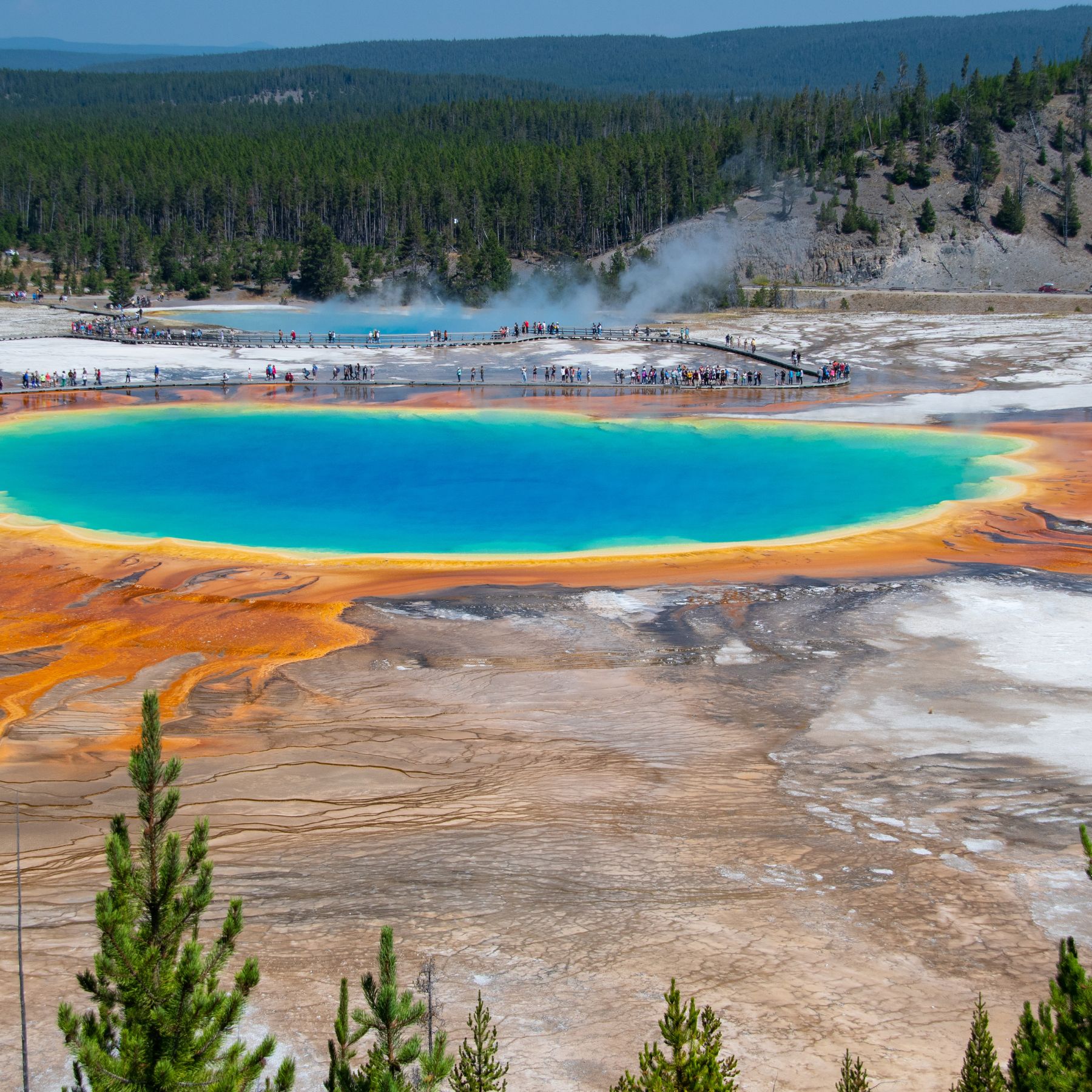 Walk to Grand Prismatic Spring overlook or stroll the Fountain Paint Pots boardwalk