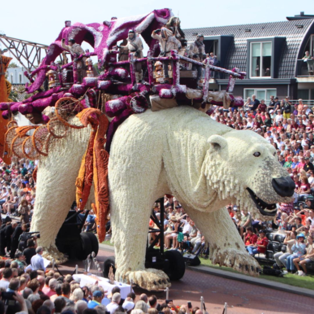 Experience the world-famous Dutch Flower Parade, Europe’s answer to the Rose Parade—with every float made entirely of fresh spring blooms.