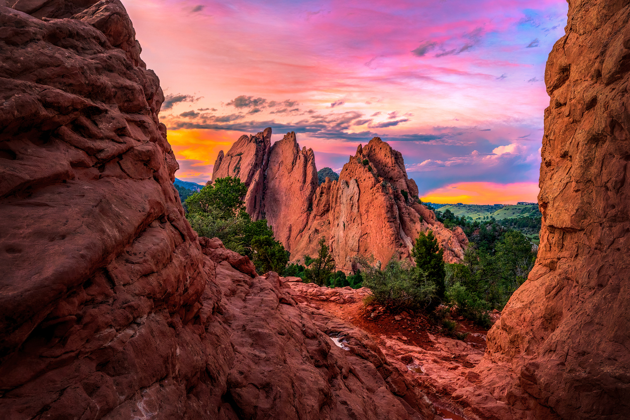 As the sun dips low, you’ll roll through the glowing sandstone formations of Garden of the Gods, continue into the forested ravines of North Cheyenne Cañon Park, stop at picturesque Helen Hunt Falls, and pass through the charming mountain town of Manitou Springs.