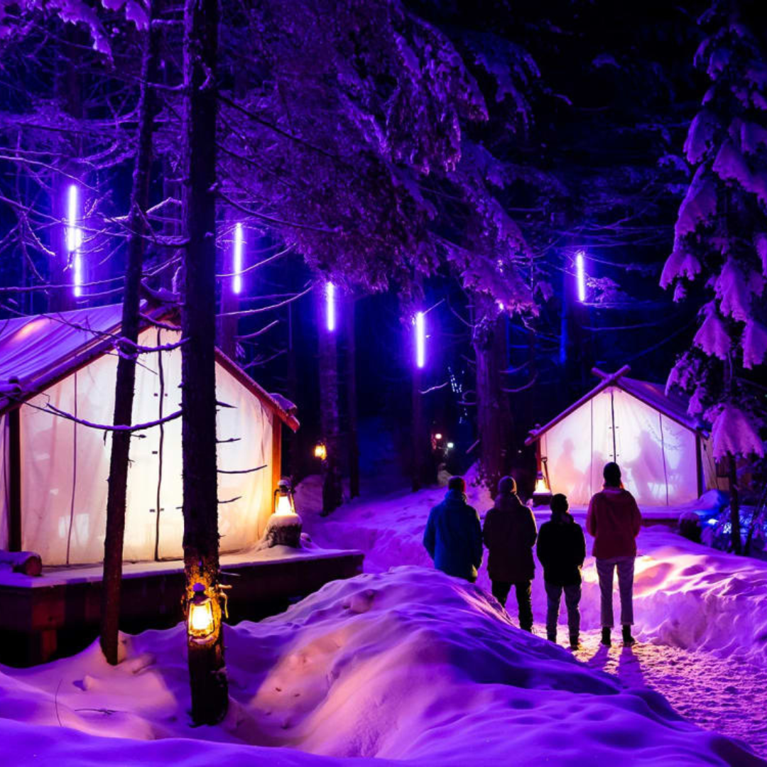 Experience an illuminated night walk through the forest, where lights, sound, and storytelling bring the winter landscape to life. -