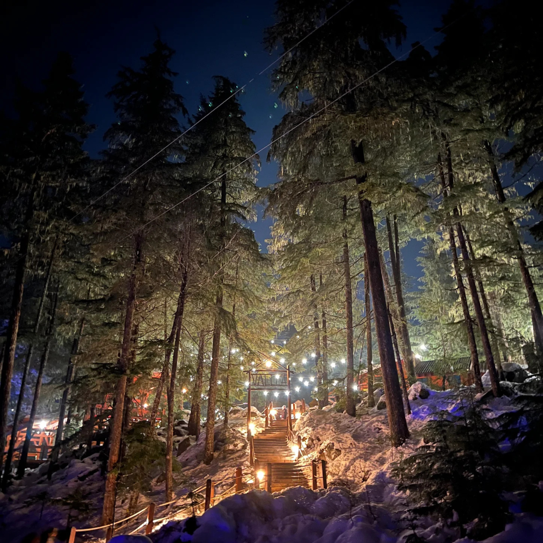 As night falls, the group will experience Vallea Lumina, Whistler’s immersive multimedia forest walk. Lights, sound, and storytelling transform the winter woods into a magical world, creating a sense of wonder as we follow the illuminated pathway through the trees. It’s a beautiful blend of nature and creative artistry, perfect for a winter night.